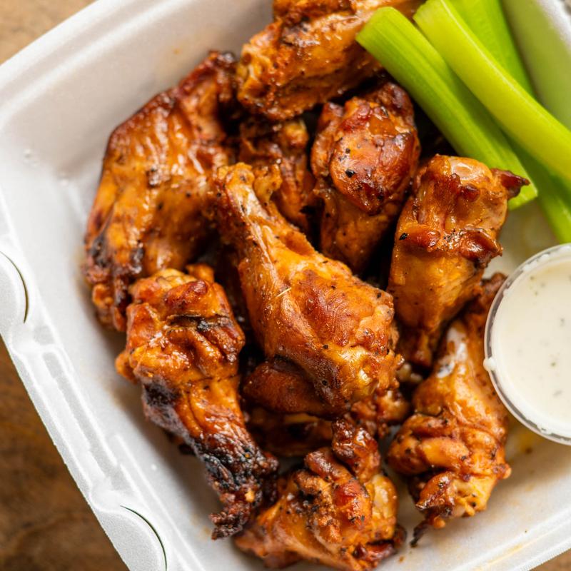 Smoky and seasoned chicken wings served with crisp celery sticks and a side of ranch dressing.